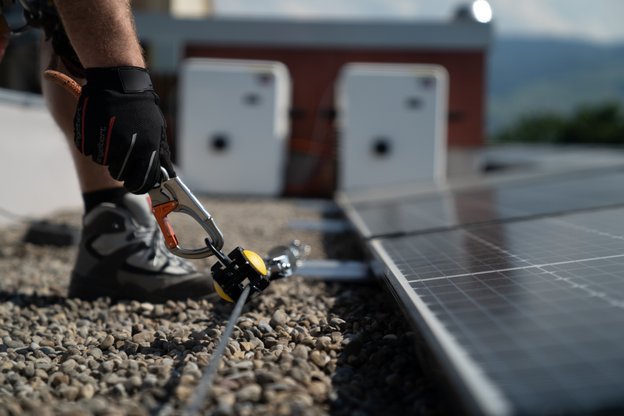 Die direkte Verbindung mit dem Modulfeld ermöglicht in Kombination mit der geeigneten persönlichen Schutzausrüstung gegen Absturz (PSAgA) maximale Bewegungsfreiheit um die komplette PV-Anlage. So ist für Monteure das Begehen des absturzgefährdeten Bereiches ohne zusätzliches und aufwendiges Ein- und Aushaken möglich.