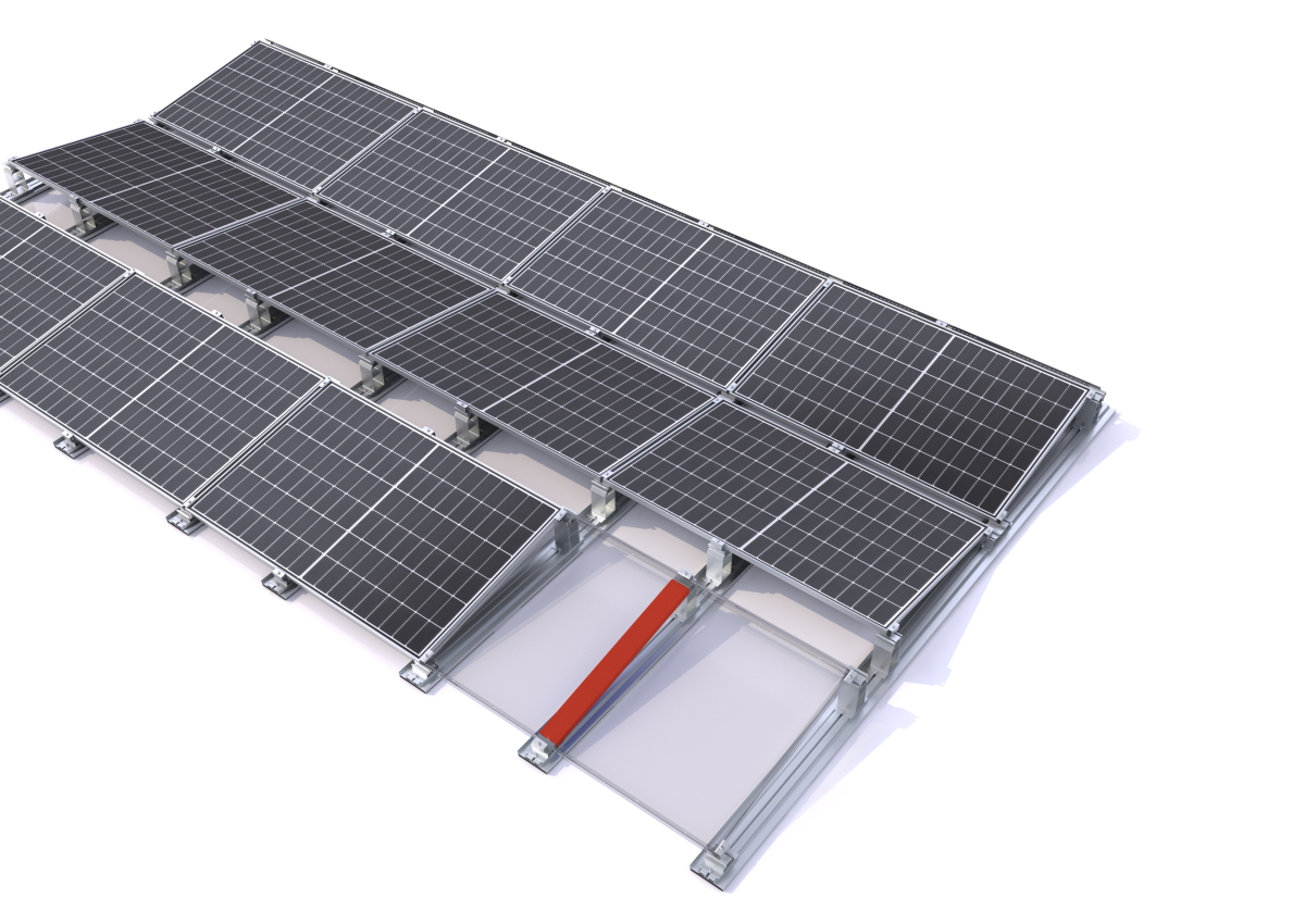 Sorgt mit Stützen und Klemmung am Modul für zusätzliche Stabilität. Vorteile: Unterstützung der Lastverteilung, Verringerung der Flächenpressung auf die Dämmung, Erhöhung der Tragfähigkeit und Widerstandsfähigkeit gegen Wind- und Schneelasten. Sicherheitsvorteil bei größeren Modulen und anspruchsvollen Dachbedingungen.